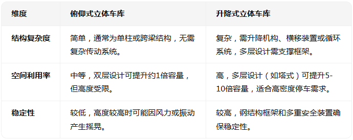 俯仰式立體車庫與升降式立體車庫的核心區別在于運動方式、結構特點、適用場景及成本效益,具體分析如下: